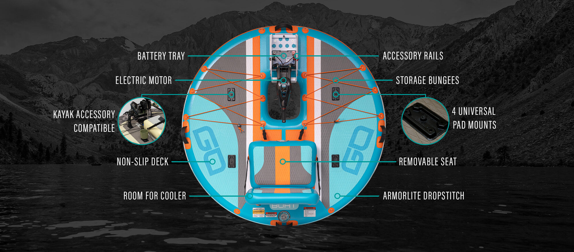 The GoBoat is fully electric and uses our proprietary electric motor specifically made for the GoBoat. The robust 12V, 35lbs thrust motor will move the craft at a brisk 5mph. The 5-speed motor ranges from 1 to 5 mph depending on the speed setting. The higher the speed, the higher the draw on the battery, with the range estimated based on normal use on and off the throttle.